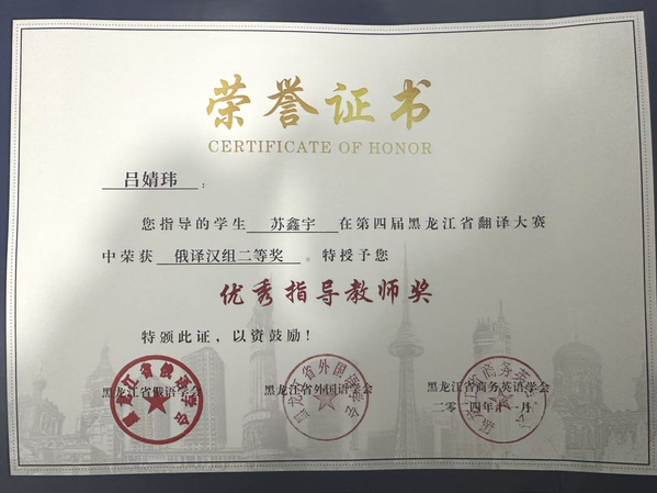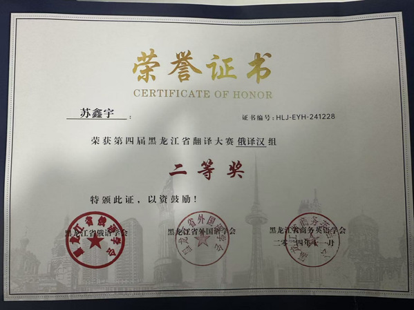 在第四届黑龙江省翻译大赛中,Bevictor伟德官网2024级材料专业员工苏鑫宇凭借出色发挥荣获二等奖,吕婧玮老师获评“优秀指导教师”。该赛事吸引了324所国内院校、14所海外院校,以及众多社会组织和机构参赛。