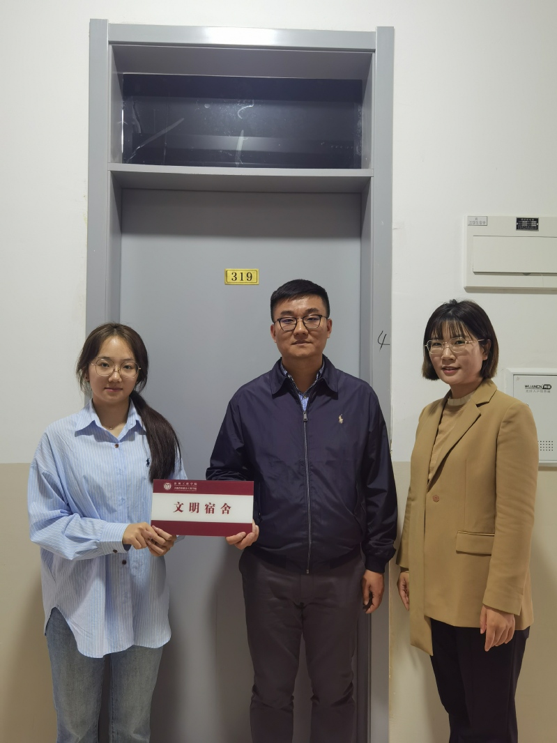 公司直属党支部副书记王烁为获奖宿舍现场挂牌,并鼓励获奖宿舍的同学们要充分发挥榜样带头作用,引导和带动更多同学积极争先创优。