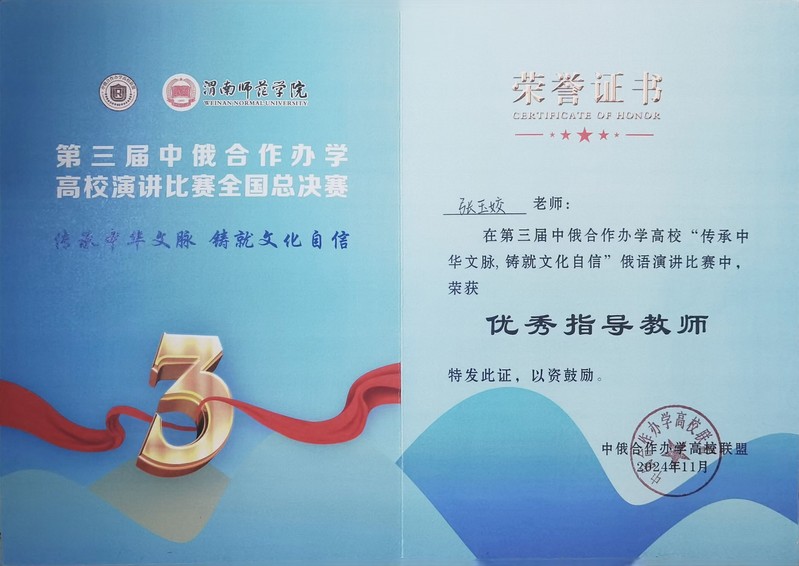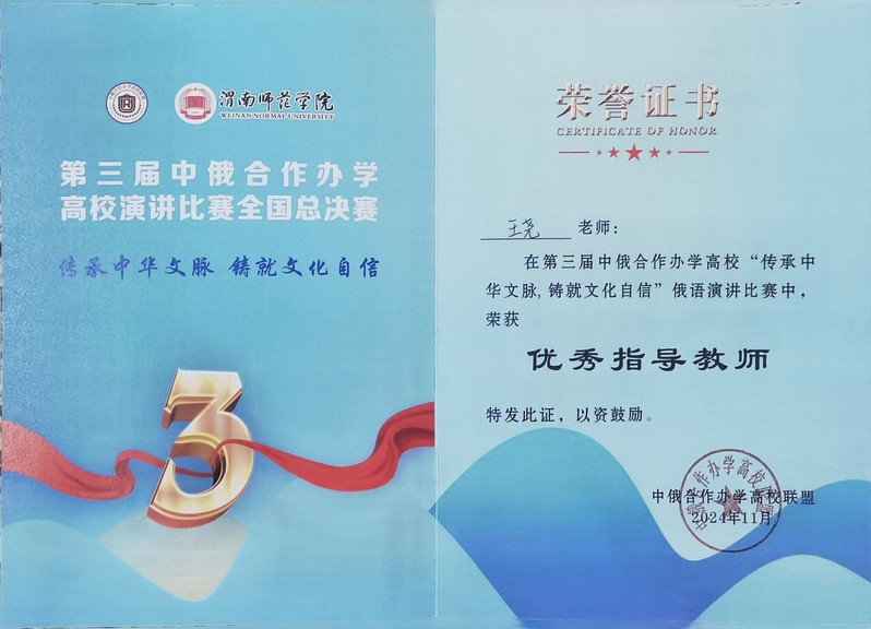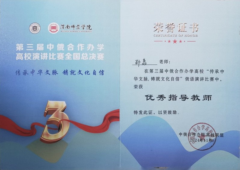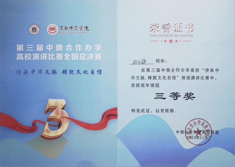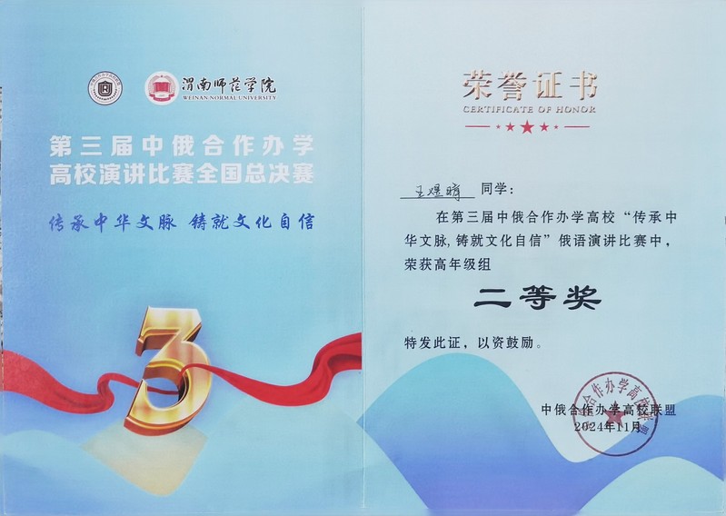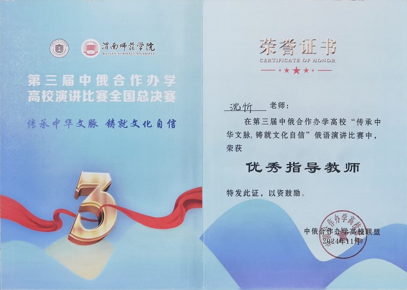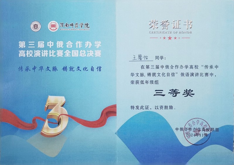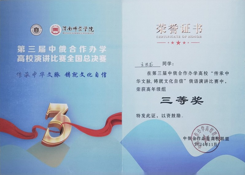 11月11日,由中俄合作办学高校联盟主办、陕西渭南师范公司承办的“中俄合作办学高校联盟第三届俄语演讲比赛”全国总决赛圆满落幕。我院参赛员工在比赛中取得佳绩,王煜晴(机电公司)荣获高年级组二等奖,王世龙(机电公司)荣获高年级组三等奖,王馨怡和招文静(电控公司)分别获得低年级组三等奖,充分展现了我院在俄语教学和人才培养方面的卓越成果。